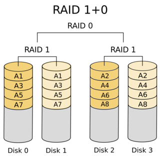- Raid 1+0(Raid10) : Mirroring then Striping / Striped Mirrors